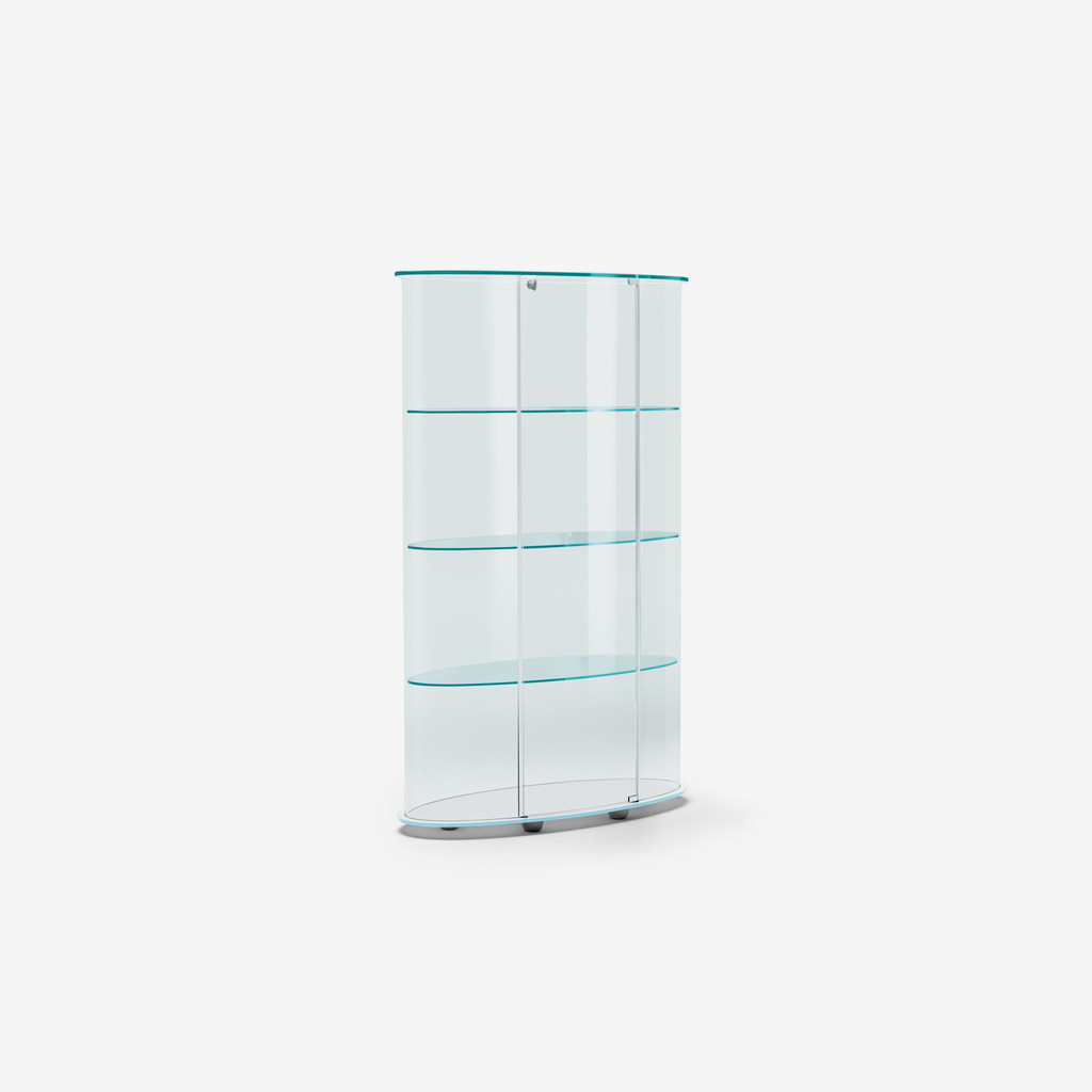 타원형 구조로 만들어진 유리쇼케이스로, 리빙룸과 다이닝룸 등 어떤 공간에 놓아도 잘 어울립니다. 기본 외형은 두께 6mm 라운드 가공 유리 / 내부선반 3개는 두께 8mm 유리 / 상부는 두께 15mm 유리로 제작되었으며 바닥은 백색 열처리 도장으로 마감된 두께 12mm 유리판과 검정색 무광도장으로 마감된 목재판 등 2가지가 있습니다. 도어에는 잠금장치가 있으며, 조명은 옵션으로 알루미늄 프레임에 연결시켜 사용할 수 있는 할로겐 또는 LED Lighting Kit가 있습니다.