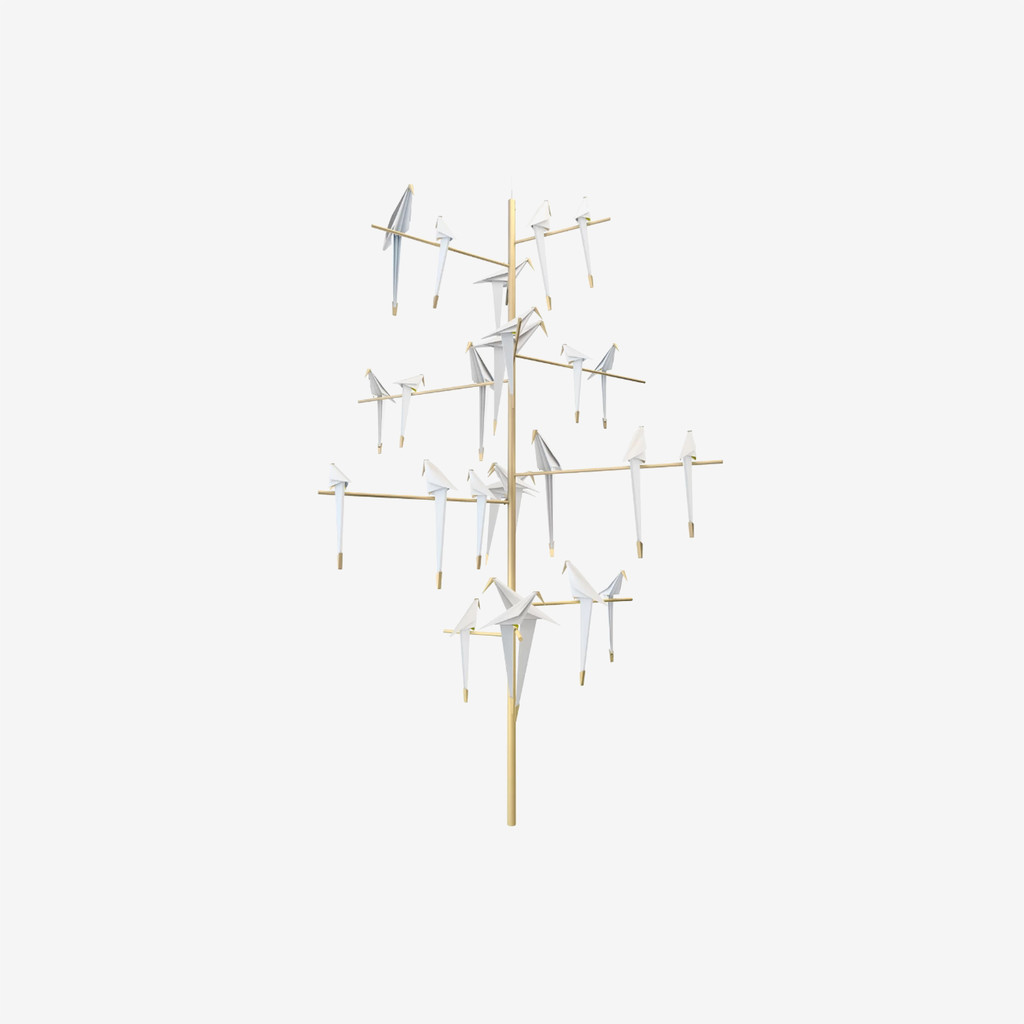 나뭇가지에 앉아 사랑을 이야기하고 노래하며 인생을 즐기는 새보다 더 시적이며 우아하고 매혹적인 것은 무엇일까요? 우리 모두는 이런 이미지를 생각하며 바쁜 일상에서 잠시 시간을 내어 자연과 아름다움의 위대함을 감상합니다. Perch는 런던에서 활동하고 있는 디자이너 Umut Yamac이 자연이 만들어내는 조화와 움직임의 아름다움에서 영감을 받아 만든 조명입니다. 얇은 플라스틱판을 접어 만들어진 추상적인 새 모양의 조명으로, 조명을 켰을 때 마치 따스한 햇볕을 받은 듯한 서정적인 우아함이 인상깊은 디자인입니다. 부드럽게 만지면 부리와 꼬리 부분에 달린 금속 장식 무게에 의해 앞뒤로 흔들리면서 부드러운 빛과 함께 봄의 약속을 가져다 줄 것 입니다. Perch Light Tree는 큰 새조명과 작은 새조명 25개가 달려있는 대형 샹들리에 입니다. Perch family에는 Perch Light Tree외에 Perch Light Branch, Perch Light Floor, Perch Light Table이 있습니다.