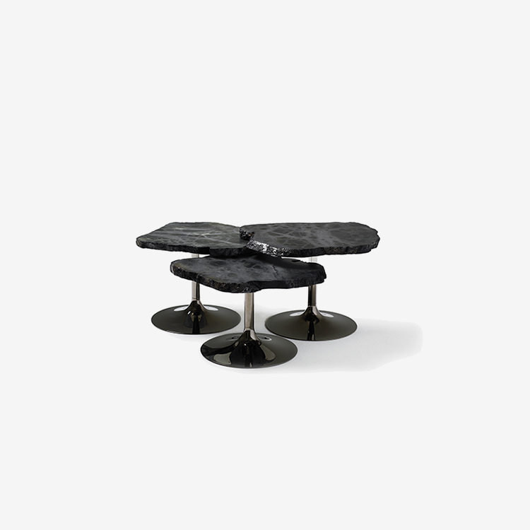 Cicladi(치클라디)는 불규칙하게 들쑥날쑥하게 에지처리가 된 알라바스터(Alabaster) 상판에 원뿔형 메탈 베이스로 이루어진 스몰테이블로, 위에서보면 마치 섬처럼 보이기도 합니다. 알라바스터는 백색과 밝은 회색 계열의 Natural 색상이지만, 이 Natural에 착색을 해서 Amber·Malachite green·Lapis lazuli blue·Black·pompei red 등 6가지 색상의 상판이 있으며, 하부 베이스는 Gole·Palladium·Ruthenium 등 3가지 색상이 있습니다. 테이블 높이도 370·430·490 mm 3가지에서 선택할 수 있는데 높이가 다른 2~3개를 조합하면 커피테이블로도 사용할 수 있습니다.